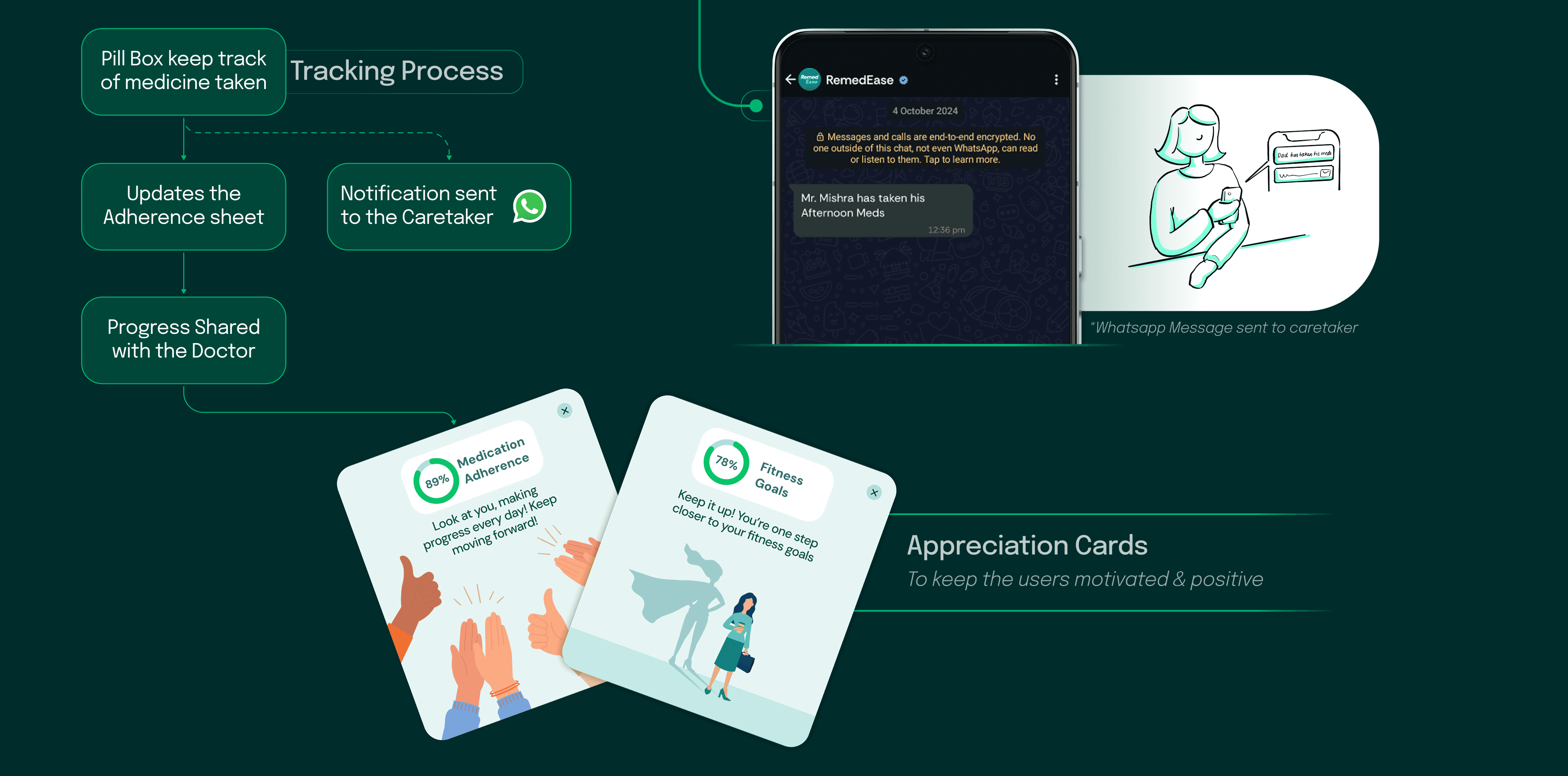 RemedEase is a diabetes management system consisting of an app and a smart pill case which simplifies diet and medication instructions. It increases adherence through accountability